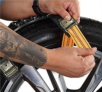 스노우체인의 벨트가 안쪽으로 가게한 뒤 타이어에 부착할 위치를 놓아줍니다. 바퀴전용 봉을 이용하여 바퀴안쪽에서 벨트를 꺼낸 후 홈에 넣습니다. 벨트를 버클에 맨 뒤 조여줍니다. 나머지 부분도 동일하게 조여줍니다. 스노우체인 탈부착을 동영상으로 보시려면 아래 링크를 클릭하세요.