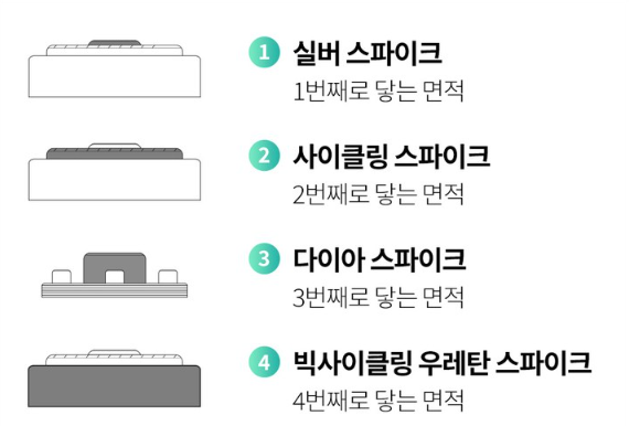 스노우체인의 마찰면적은 3차원 입체설계로 넓이 뿐만 아니라, 높이로도 최대화가 되어야합니다. 히따 스노우체인은 눈과 닿는 우레탄의 넓이 면적뿐만아니라 스파이크 돌기와 높이를 모두 다르게하고, 스파이크 개수를 최대화하여 스파이크가 닿는 넓이와 높이 면적을 최대로 높였습니다.