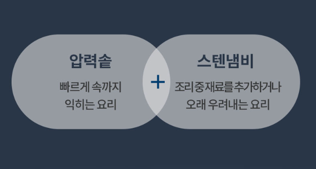 저압냄비란 압력솥과 스텐냄비의 장점을 하이브리드한 개념으로 빠르게 속까지 익히면서 조리 중 재료를 추가하거나 오래 우려내는 스텐냄비의 장점만 뽑아 탄생한 냄비라고 생각하시면 됩니다. 압력솥은 한번 불에 올리면 중간에 뚜껑을 열지 못하는데 이 제품은 언제든 마음껏 뚜껑을 열어 제낄 수? 있습니다.
