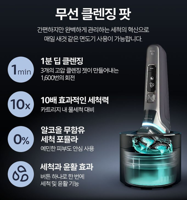 간편한 충전과 무선 클랜징 팟으로 완벽한 면도기 관리
