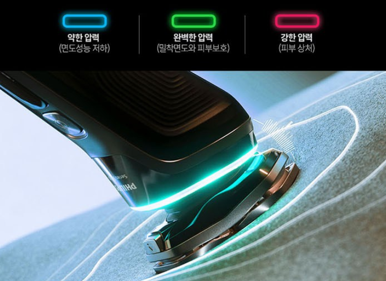 200,000개의 마이크로비즈로 특수 코팅된 면도기 헤드가 피부 마찰을 최대 25%까지 최소화 하여 편안하고 부드럽게 면도를 하게 도와줍니다. 마이크로비즈 코팅으로 피부 트러블을 최소화하게 만드는 전기면도기 입니다. 그리고 압력컨트롤센서가 피부가 받는 자극을 섬세하게 감지하여 그에 맞는 불빛을 내보내어서 과도한 압박으로 피부가 상하지 않도록 가이드 해주는 섬세한 라이트 시그널이 예술입니다.
